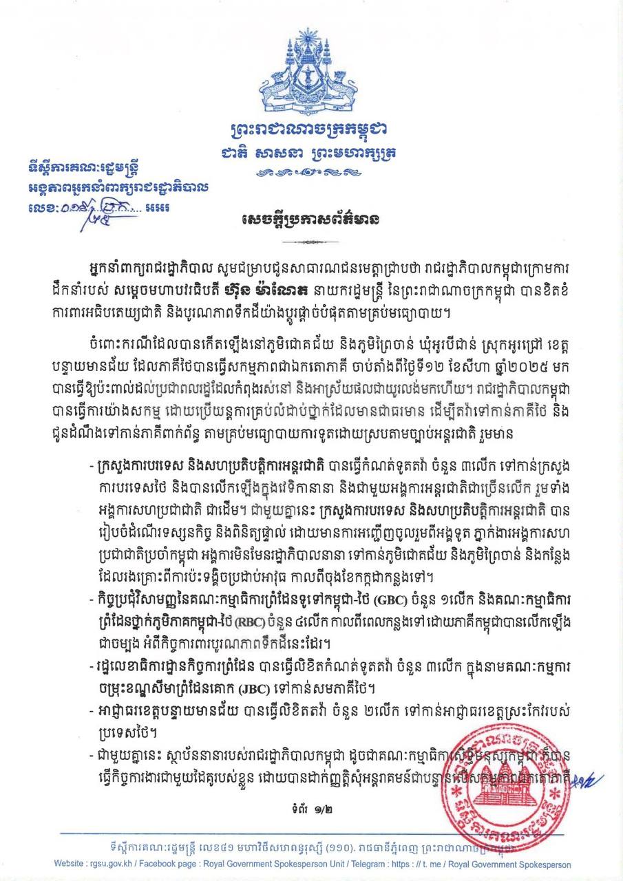 ក្នុងសេចក្ដីប្រកាសព័ត៌មាននេះបានបញ្ជាក់ថា ចំពោះករណីដែលបានកើតឡើងនៅភូមិជោគជ័យ និងភូមិព្រៃចាន់ ឃុំអូរបីជាន់ ស្រុកអូរជ្រៅ ខេត្តបន្ទាយមានជ័យ ដែលភាគីថៃបានធ្វើសកម្មភាពជាឯកតោភាគី ចាប់តាំងពីថ្ងៃទី១២ ខែសីហា ឆ្នាំ២០២៥មក បានធ្វើឲ្យប៉ះពាល់ដល់ប្រជាពលរដ្ឋដែលកំពុងរស់នៅ និងអាស្រ័យផលជាយូរលង់មកហើយ។