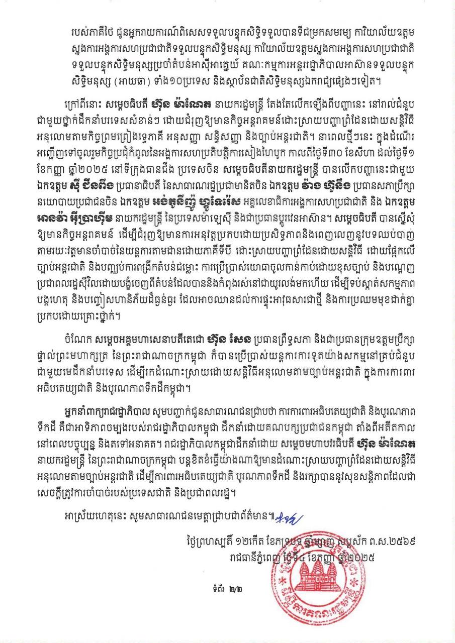 អង្គភាពអ្នកនាំពាក្យរាជរដ្ឋាភិបាល នៅថ្ងៃទី៤ ខែកញ្ញា ឆ្នាំ២០២៥នេះ បានចេញសេចក្ដីប្រកាសព័ត៌មាន បង្ហាញអំពីការចិត្តទុកដាក់ខ្ពស់បំផុតរបស់សម្ដេចមហាបវរធិបតី ហ៊ុន ម៉ាណែត នាយករដ្ឋមន្ដ្រីកម្ពុជា លើកិច្ចការពារបូរណភាពទឹកដី និងចំណាត់ការនានារបស់រាជរដ្ឋាភិបាលលើវិវាទព្រំដែនជាមួយប្រទេសថៃ។