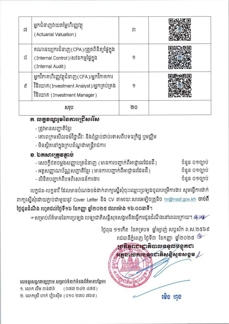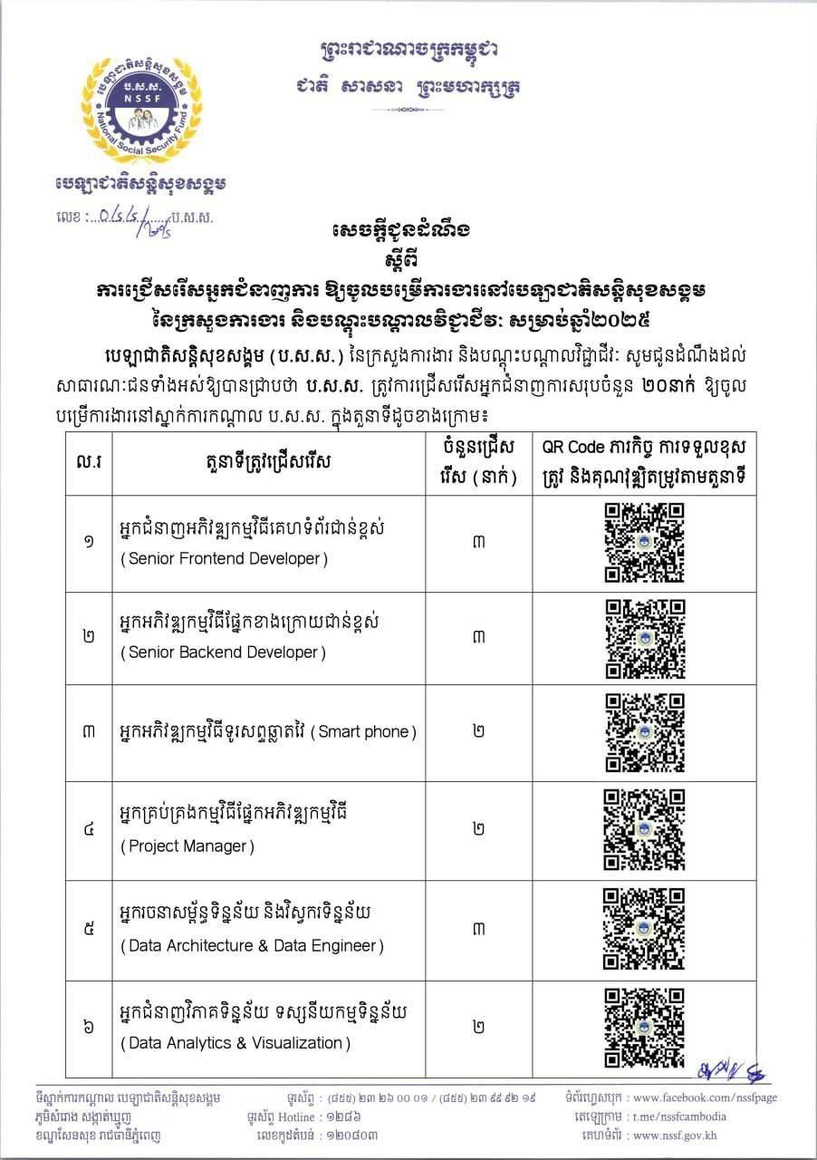 តាមរយៈសេចក្ដីជូនដំណឹងរបស់ក្រសួងការងារនិងបណ្ដុះបណ្ដាលវិជ្ជាជីវៈ ចុះថ្ងៃទី៣ ខែកញ្ញា ឆ្នាំ២០២៥ បេឡាជាតិសន្តិសុខសង្គម ហៅកាត់ថា ប.ស.ស. នៃក្រសួងការងារ និងបណ្ដុះបណ្ដាលវិជ្ជាជីវៈ បានប្រកាសជ្រើសរើសអ្នកជំនាញការចំនួន២០រូប ឲ្យចូលធ្វើការនៅស្ថាប័នរបស់ខ្លួន ដោយនឹងបិទឈប់ទទួលពាក្យត្រឹមថ្ងៃទី១៦ ខែកញ្ញា ឆ្នាំ២០២៥។