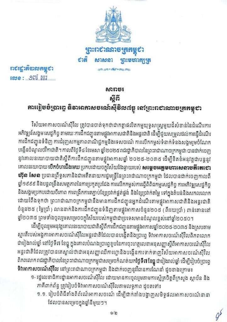 Phnom Penh, 10 October 2025 — According to a circular issued by Samdech Moha Bovor Thipadi Hun Manet, Prime Minister of the Kingdom of Cambodia, regarding the celebration of Civil Aviation Day on 7 December in Cambodia, the Kingdom is projected to welcome 25 million national and international tourists and handle 205,000 tons of air cargo by the year 2035.