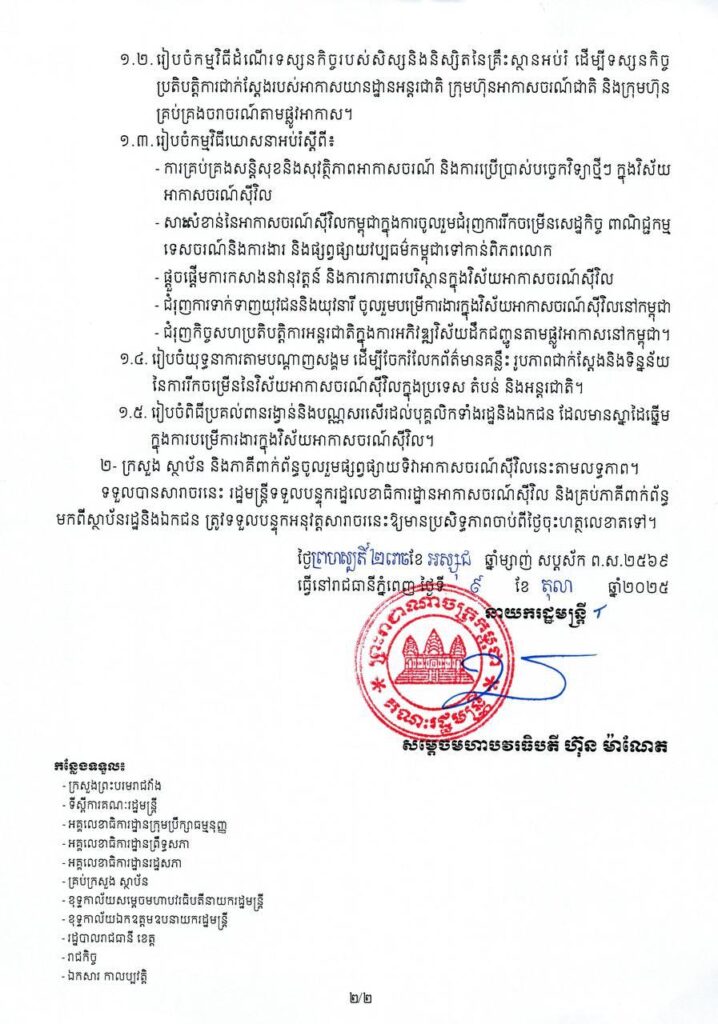 In addition, Prime Minister Hun Manet instructed the State Secretariat of Civil Aviation (SSCA), relevant ministries, institutions, partners, and stakeholders to prepare for the upcoming Civil Aviation Day 2025 celebration on 7 December.