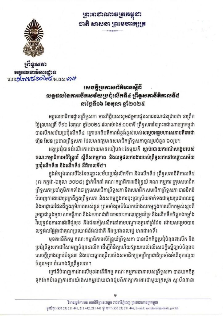 យោងតាមសេចក្តីប្រកាសព័ត៌មានរបស់អគ្គលេខាធិការដ្ឋានព្រឹទ្ធសភានៅថ្ងៃទី១៦ ខែតុលា ឆ្នាំ២០២៥ បានឱ្យដឹងថា ព្រឹទ្ធសភានៃព្រះរាជាណាចក្រកម្ពុជា បានបើកសម័យប្រជុំលើកទី៤ ក្រោមអធិបតីភាពដ៏ខ្ពង់ខ្ពស់របស់សម្តេចអគ្គមហាសេនាបតីតេជោ ហ៊ុន សែន ប្រធានព្រឹទ្ធសភា ដែលមានវត្តមានសមាជិកព្រឹទ្ធសភាចូលរួមចំនួន ៦០រូប។