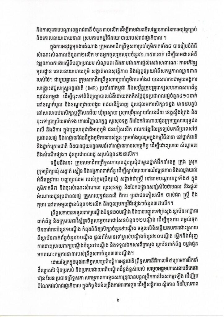 ក្នុងអំឡុងពេលបីខែនៃចន្លោះសម័យប្រជុំលើកទី៣ និងលើកទី៤ ព្រឹទ្ធសភានីតិកាលទី៥ (៧ កក្កដា-៦តុលា ២០២៥) ថ្នាក់ដឹកនាំ គណៈកម្មាធិការអចិន្ត្រៃយ៍ គណៈកម្មការ ក្រុមសមាជិក ព្រឹទ្ធសភាប្រចាំភូមិភាគទាំង៨ ក្រុមសមាជិកាព្រឹទ្ធសភា និងសមាជិក សមាជិកាព្រឹទ្ធសភា បានខិតខំបំពេញការងារជាប្រក្រតីក្នុងព្រឹទ្ធសភា និងសកម្មក្នុងការចុះប្រាស្រ័យទាក់ទងជាមួយប្រជាពលរដ្ឋ និងអាជ្ញាធរដែនដីក្នុងភូមិភាគរបស់ខ្លួន ព្រមទាំងរួមចំណែកយ៉ាងសកម្មក្នុងការលើកកម្ពស់ស្មារតី រួមគ្នាជាធ្លុងមួយ សាមគ្គីភាព និងឯកភាពជាតិ តាមរយៈការឧបត្ថម្ភគាំទ្រ និងលើកទឹកចិត្តកងកម្លាំង វីរយុទ្ធជនការពារជាតិជួរមុខ និងជនភៀសសឹកនៅតាមបណ្តាខេត្តនៅព្រំដែន ដោយសម្រេចបានលទ្ធផលផ្លែផ្កាជាគុណប្រយោជន៍ដល់ជាតិ និងប្រជាពលរដ្ឋ។