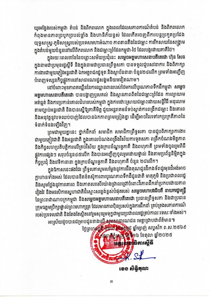 នៅចំពោះមុខភាពគឃ្លីននៃការឈ្លានពានរបស់ថៃមកលើបូរណភាពទឹកដីកម្ពុជា សម្តេចអគ្គមហាសេនាបតីតេជោ បានបង្ហាញឫសគល់ និងស្ថានភាពពិតនៃជម្លោះព្រំដែន ការព្យាយាម អត់ធ្មត់ និងការប្រកាន់គោលជំហររបស់កម្ពុជា ក្នុងការដោះស្រាយជម្លោះដោយសន្តិវិធី អនុលោម តាមច្បាប់អន្តរជាតិ និងបានស្នើឱ្យភាគីមិត្ត ជួយអន្តរាគមន៍ទប់ស្កាត់ការពង្រីកជម្លោះ និងគោរព និងអនុវត្តនូវបទឈប់បាញ់ដែលបានឯកភាពព្រមព្រៀងគ្នា ដើម្បីអាចវិលទៅរកប្រក្រតីភាពនៃទំនាក់ទំនងឡើងវិញ៕