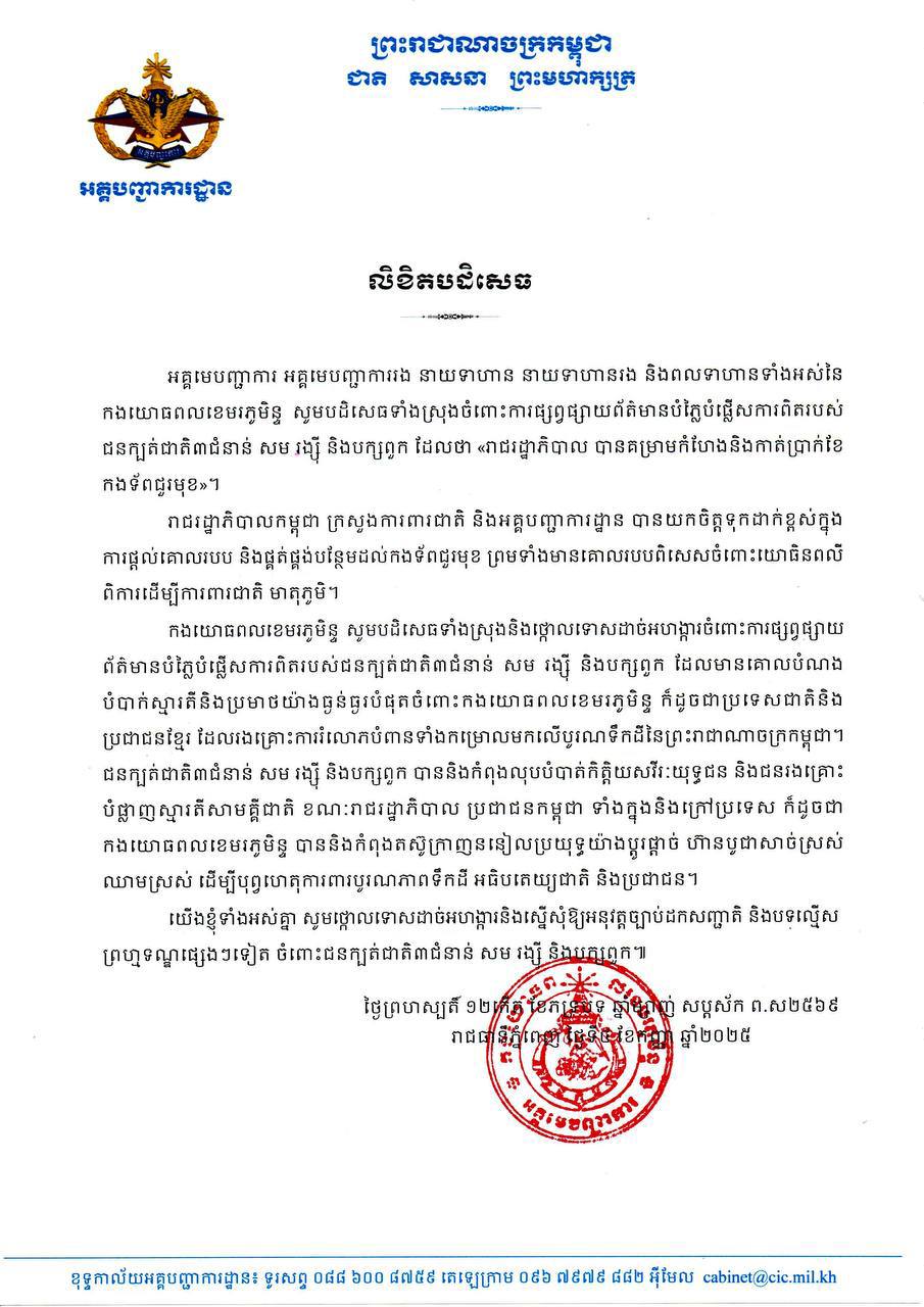 លិខិតដដែលបានគូសរំលេចថា ការផ្សព្វផ្សាយព័ត៌មានបំភ្លៃបំផ្លើសការពិតរបស់ជនក្បត់ជាតិ៣ជំនាន់ សម រង្ស៊ី និងបក្ខពួក មានគោលបំណងបំបាក់ស្មារតីនិងប្រមាថយ៉ាងធ្ងន់ធ្ងរបំផុតចំពោះកងយោធពលខេមរភូមិន្ទ ក៏ដូចជាប្រទេសជាតិ និងប្រជាជនខ្មែរ ដែលរងគ្រោះពីការរំលោភបំពានទាំងកម្រោលមកលើបូរណភាពទឹកដីនៃព្រះរាជាណាចក្រកម្ពុជា។