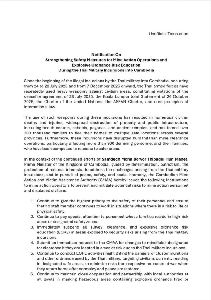 យោងតាមសេចក្តីណែនាំរបស់អាជ្ញាធរកម្ពុជា គ្រប់គ្រងសកម្មភាពកំចាត់មីន និង សង្គ្រោះជនពិការរដោយសារមីននៅថ្ងៃទី២៦ ខែធ្នូ ឆ្នាំ២០២៥ ស្តីពីការពង្រឹងវិធានការសុវត្ថិភាពចំពោះប្រតិបត្តិការសកម្មភាពមីន និងការអប់រំផ្សព្វផ្សាយការយល់ដឹងពីយុទ្ធភណ្ឌគ្រឿងផ្ទុះ អំឡុងពេលឈ្លានពានរបស់យោធាថៃមកលើកម្ពុជាបានឲ្យដឹងថា ចាប់តាំងពីការចាប់ផ្តើម នៃសកម្មភាពឈ្លានពានខុសច្បាប់របស់យោធាថៃមកលើកម្ពុជា ដោយលើកទី១ ពីថ្ងៃទី២៤ ដល់ថ្ងៃ២៨ ខែកក្កដា ឆ្នាំ២០២៥ និងលើកទី២ ពីថ្ងៃទី៧ ខែធ្នូ ឆ្នាំ២០២៥ មកទល់ពេលបច្ចុប្បន្ន យោធាថៃបានប្រើប្រាស់យុទ្ធោបករណ៍ធុនធ្ងន់គ្រប់ប្រភេទមកលើតំបន់ស៊ីវិល និងបានបំពានការអនុវត្តបទឈប់បាញ់នៅថ្ងៃទី២៨ ខែកក្កដា ឆ្នាំ២០២៥ សេចក្តីថ្លែងការណ៍រួមទីក្រុងគូឡាឡាំពួរ ថ្ងៃទី២៦ ខែតុលា ឆ្នាំ២០២៥ ធម្មនុញ្ញអង្គការសហប្រជាជាតិ ធម្មនុញ្ញអាស៊ាន និងរំលោភលើគោលការណ៍ ជាមូលដ្ឋាននៃច្បាប់អន្តរជាតិ។