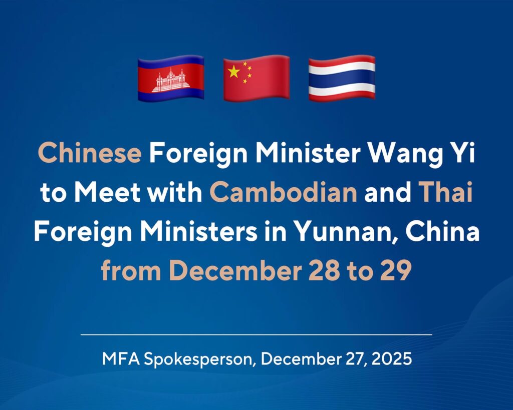លោក វ៉ាង យី សមាជិកការិយាល័យនយោបាយនៃគណៈកម្មាធិការកណ្តាលបក្សកុម្មុយនិស្តចិន និងជារដ្ឋមន្ត្រីក្រសួងការបរទេស នឹងជួបលោក ប្រាក់ សុខុន ឧបនាយករដ្ឋមន្ត្រី និងជារដ្ឋមន្ត្រីក្រសួងការបរទេសកម្ពុជា និងលោក ស៉ីហាសាក់ ភួងកេតកែវ រដ្ឋមន្ត្រីក្រសួងការបរទេសថៃ នៅខេត្តយូណាន ចាប់ពីថ្ងៃទី ២៨ ដល់ថ្ងៃទី ២៩ ខែធ្នូ ហើយតំណាងយោធានៃប្រទេសទាំង ៣ ក៏នឹងចូលរួមផងដែរ។