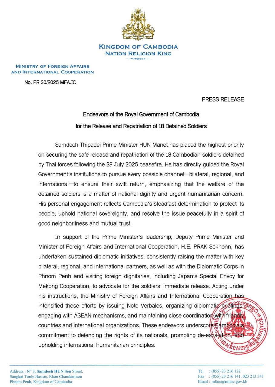 Endeavors of the Royal Government of Cambodia for the Release and Repatriation of 18 Detained Soldiers