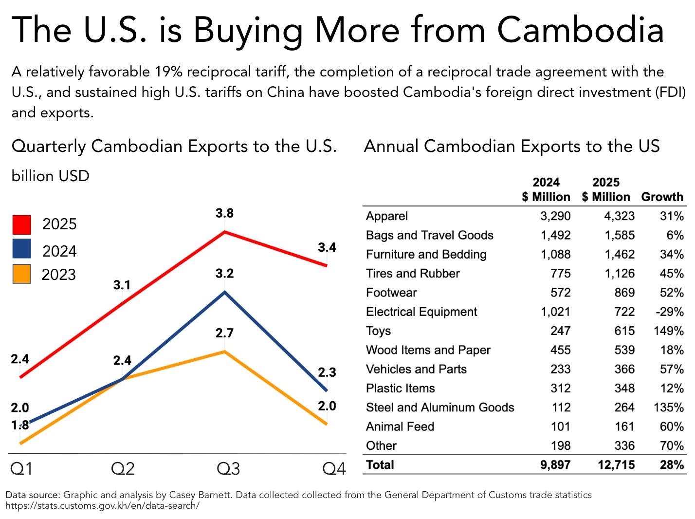 For over 26 years, the U.S. has been a dependable source of revenue for Cambodia. Currently, the U.S. awaits ratification of the October 2025 reciprocal trade agreement by the Cambodian National Assembly.