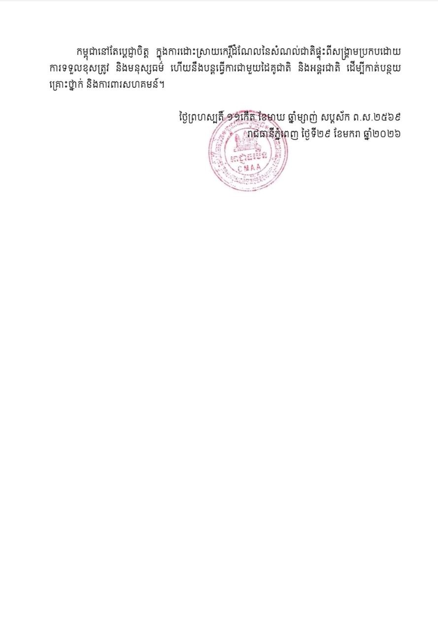 អាជ្ញាធរកម្ពុជាគ្រប់គ្រងសកម្មភាពកំចាត់មីននិងសង្គ្រោះជនពិការដោយសារមីន នៅថ្ងៃទី២៩ ខែមករា ឆ្នាំ២០២៦ បានសម្តែងការព្រួយបារម្ភយ៉ាងខ្លាំងចំពោះឧប្បត្តិហេតុផ្ទុះគ្រាប់បែកចង្កោមដែលបណ្តាលឱ្យបុគ្គលិកក្រុមហ៊ុនតបណ្តាញអគ្គិសនីចំនួន៣នាក់ បានរងរបួសធ្ងន់ ស្រាលនៅព្រឹកថ្ងៃទី២៩ ខែមករា ឆ្នាំ២០២៦ នៅស្រុកបន្ទាយអំពិល ខេត្តឧត្តរមានជ័យ។