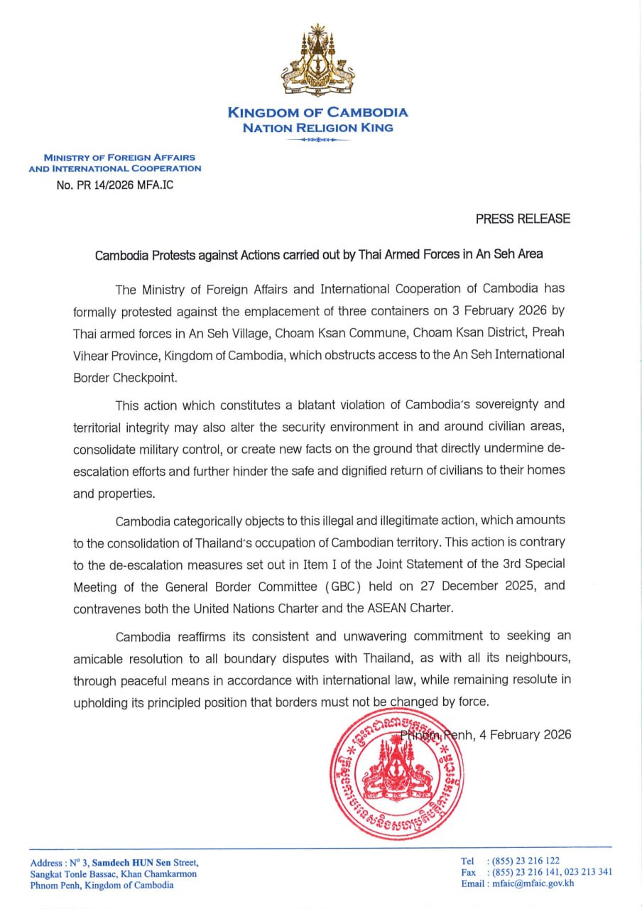 ក្រសួងការបរទេសនិងសហប្រតិបត្តិការអន្តរជាតិនៃព្រះរាជាណាចក្រកម្ពុជានៅថ្ងៃទី៤ ខែកុម្ភៈ ឆ្នាំ២០២៦ បានធ្វើការតវ៉ាជាផ្លូវការប្រឆាំងនឹងការដាក់កុងតឺន័រចំនួនបី ដោយកងកម្លាំងប្រដាប់អាវុធថៃ នៅក្នុងភូមិអានសេះ ឃុំជាំក្សាន្ត ស្រុកជាំក្សាន្ត ខេត្តព្រះវិហារ នៃព្រះរាជាណាចក្រកម្ពុជា ដែលរារាំងដល់ការចូលទៅកាន់ច្រកព្រំដែនអន្តរជាតិអានសេះ។ នេះបើយោងតាមសេចក្តីប្រកាសព័ត៌មានរបស់ក្រសួងការបរទេសកម្ពុជា។