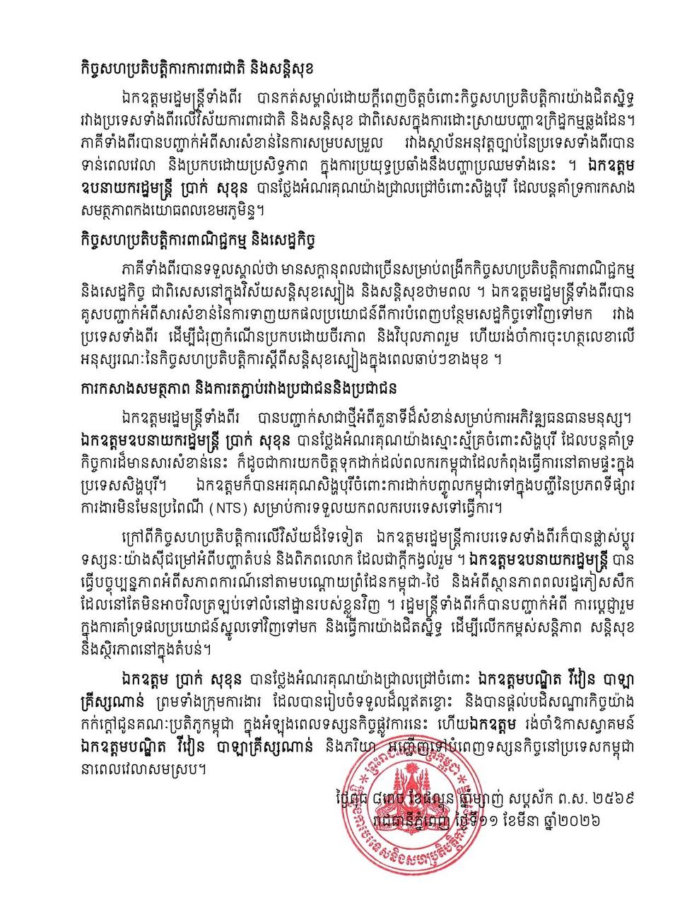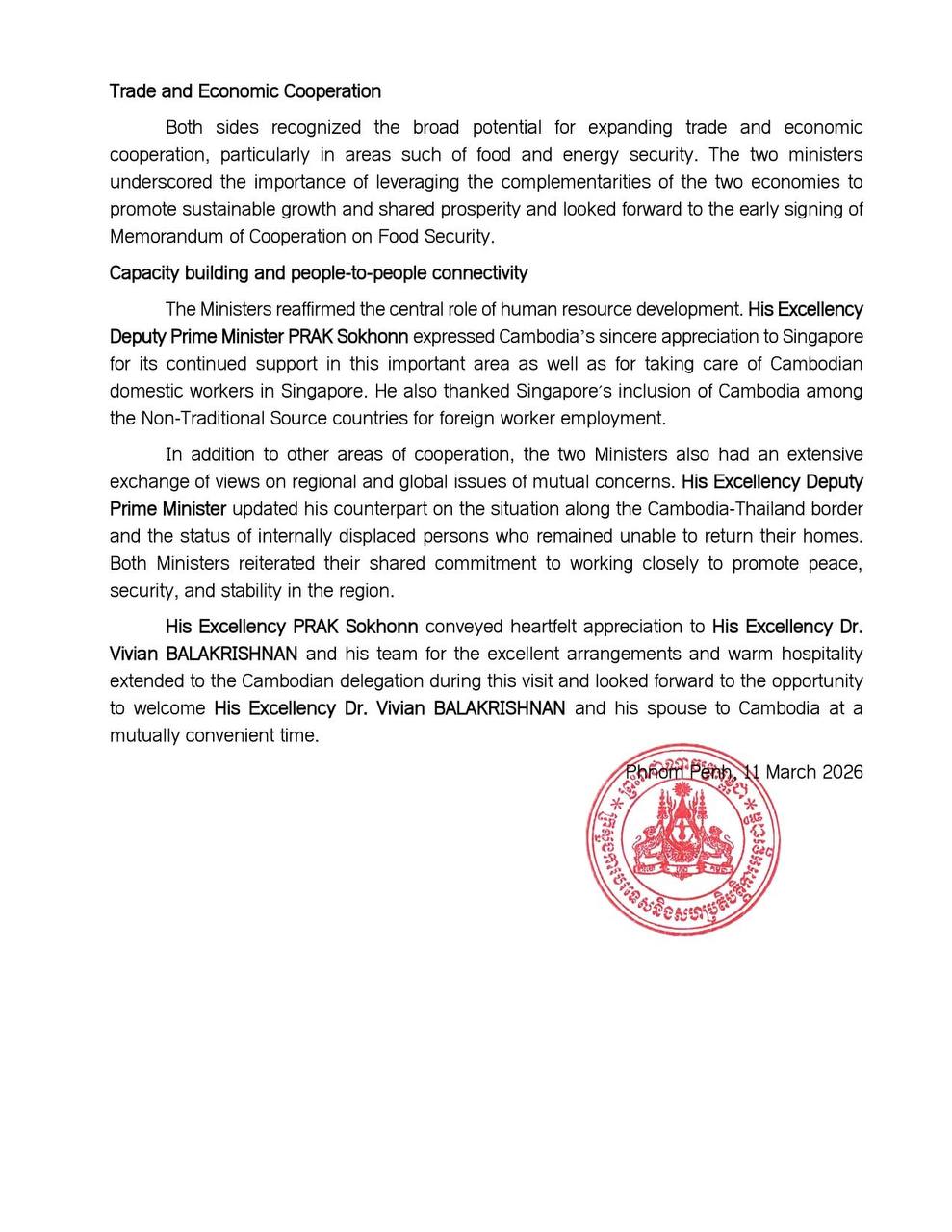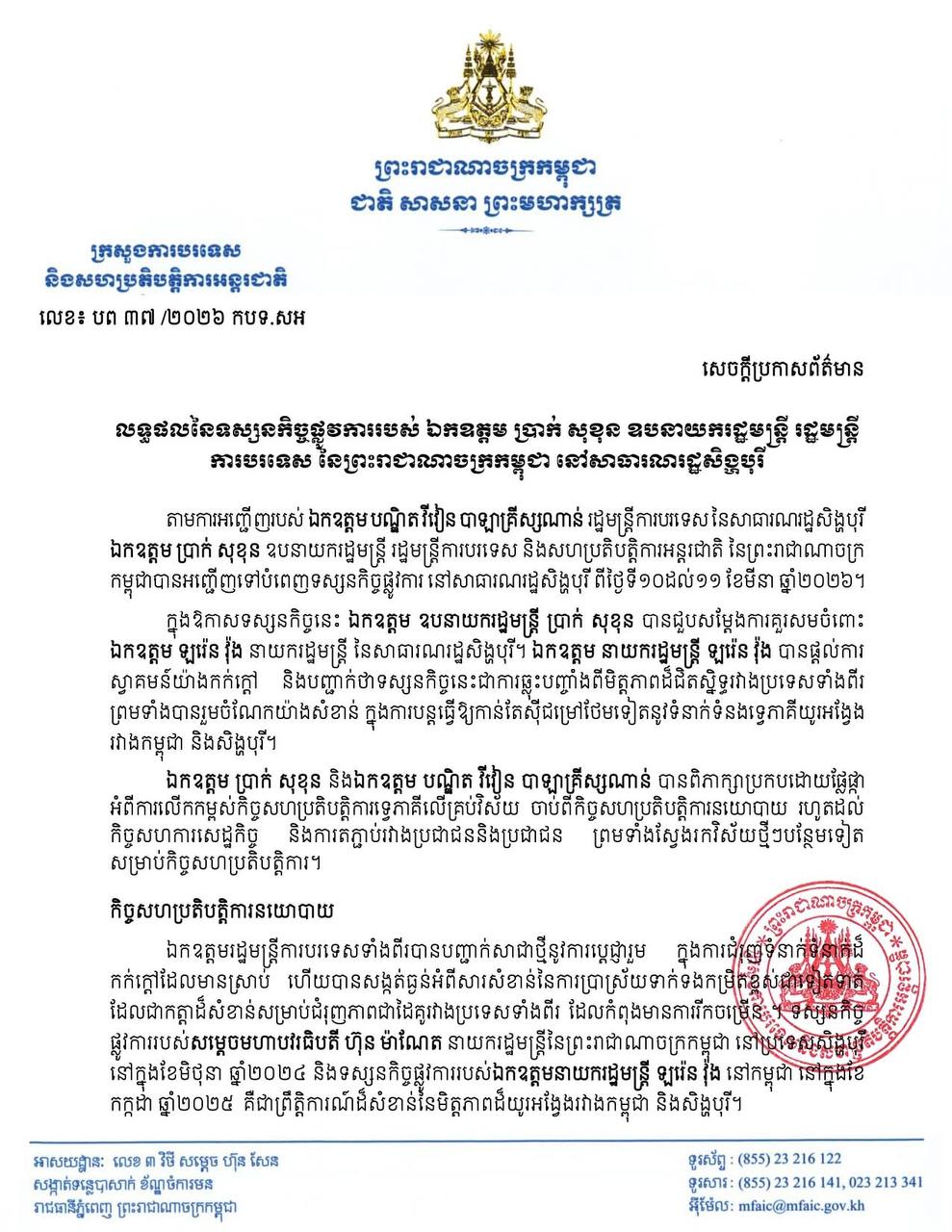 យោងតាមសេចក្តីប្រកាសព័ត៌មានរបស់ក្រសួងការបរទេសនិងសហប្រតិបត្តិការអន្តរជាតិចុះនៅថ្ងៃទី១១ ខែមីនា ឆ្នាំ២០២៦ ស្តីពីលទ្ធផលនៃទស្សនកិច្ចផ្លូវការរបស់ឯកឧត្តម ប្រាក់ សុខុន ឧបនាយករដ្ឋមន្រ្តី រដ្ឋមន្រ្តីការបរទេសនៃព្រះរាជាណាចក្រកម្ពុជានៅសាធារណរដ្ឋសិង្ហបុរី បានឱ្យដឹងថា ភាគីទាំងពីរកម្ពុជា-សិង្ហបុរីប្តេជ្ញាបន្តកិច្ចសហប្រតិបត្តិការយ៉ាងជិតស្និទ្ធ រវាងប្រទេសទាំងពីរលើវិស័យការពារជាតិ និងសន្តិសុខ ជាពិសេសក្នុងការដោះស្រាយបញ្ហាឧក្រិដ្ឋកម្មឆ្លងដែន។ ភាគីទាំងពីរបានបញ្ជាក់អំពីសារសំខាន់នៃការសម្របសម្រួល រវាងស្ថាប័នអនុវត្តច្បាប់នៃប្រទេសទាំងពីរបាន ទាន់ពេលវេលា និងប្រកបដោយប្រសិទ្ធភាព ក្នុងការប្រយុទ្ធប្រឆាំងនឹងបញ្ហាប្រឈមទាំងនេះ ។