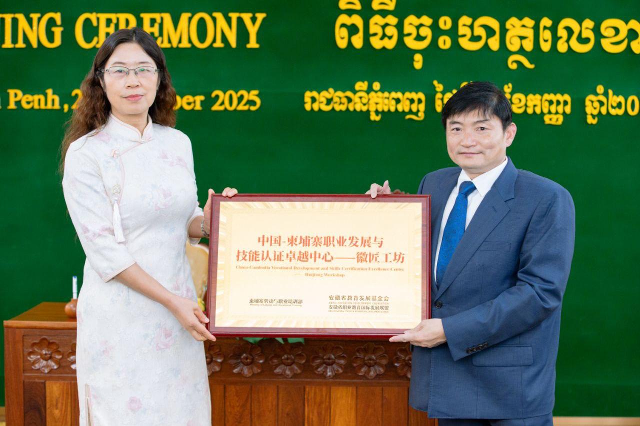 ក្រសួងការងារ និងបណ្ដុះបណ្ដាលវិជ្ជាជីវៈ និងមូលនិធិអភិវឌ្ឍន៍វិស័យអប់រំ ខេត្តអានហួយ ប្រទេសចិន កាលពីរសៀលថ្ងៃទី២ ខែកញ្ញា ឆ្នាំ២០២៥នេះ បានចុះហត្ថលេខាលើអនុស្សរណៈនៃការយោគយល់គ្នា (MoU) ដើម្បីបង្កើតរួមគ្នានូវមជ្ឈមណ្ឌលបណ្តុះបណ្តាលជំនាញវិជ្ជាជីវៈ និងមជ្ឈមណ្ឌលឧត្តមភាពទទួលស្គាល់ជំនាញកម្ពុជា-ចិន—រោងជាង ហួយជាំង (Huijiang workshop) ក្រោមអធិបតីភាពដ៏ខ្ពង់ខ្ពស់ ឯកឧត្តម ហេង សួរ រដ្ឋមន្រ្តីក្រសួងការងារ និងបណ្ដុះបណ្ដាលវិជ្ជាជីវៈ និងលោកស្រី Ling Shuangying អគ្គលេខាធិការនៃសម្ព័ន្ធអភិវឌ្ឍន៍វិស័យអប់រំបណ្តុះបណ្តាលវិជ្ជាជីវៈអន្តរជាតិ ខេត្តអានហួយ ប្រទេសចិន នៅទីស្តីការក្រសួង។