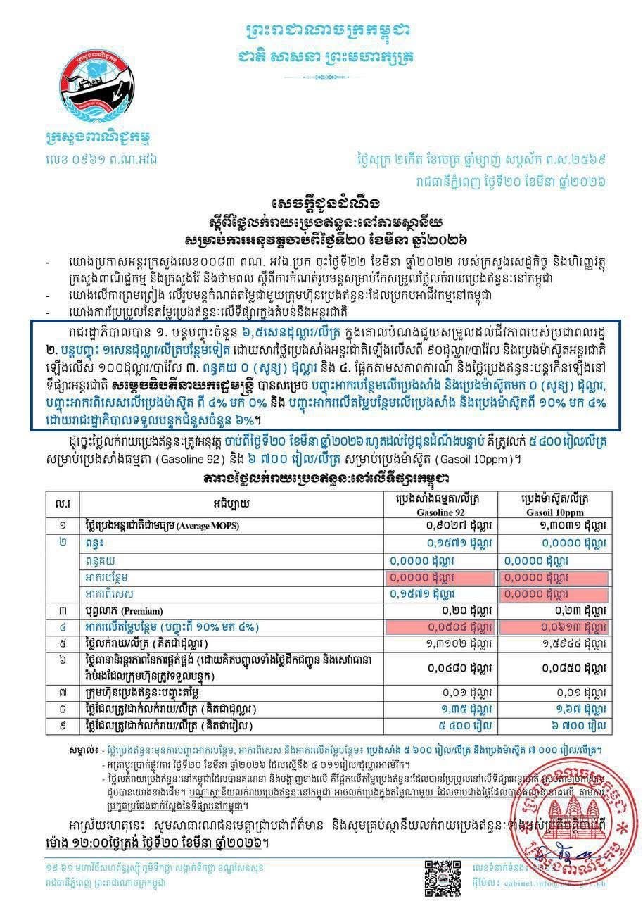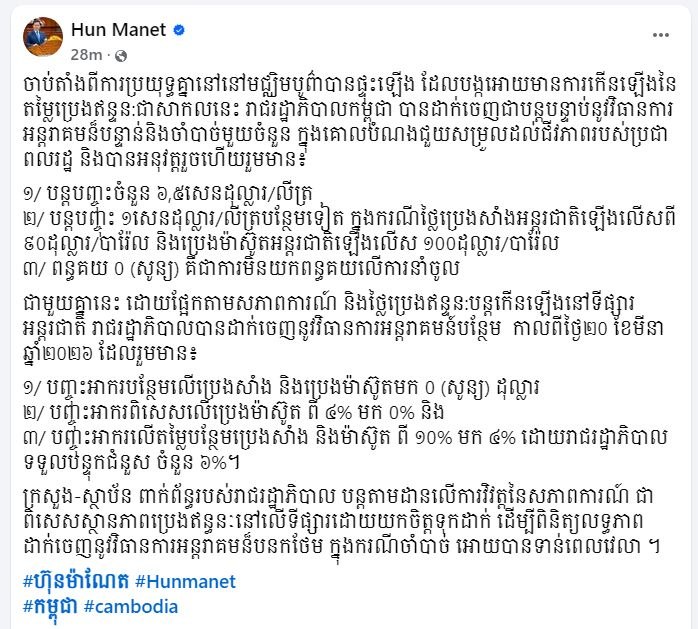 សម្តេចធិបតី ហ៊ុន ម៉ាណែត នាយករដ្ឋមន្រ្តីនៃព្រះរាជាណាចក្រកម្ពុជាតាមរយៈបណ្តាញសង្គមនៅព្រឹកថ្ងៃទី២១ ខែមីនា ឆ្នាំ២០២៦ បានបញ្ជាក់ថា ចាប់តាំងពីការប្រយុទ្ធគ្នានៅមជ្ឈិមបូព៌ាបានផ្ទុះឡើង ដែលបង្កអោយមានការកើនឡើងនៃតម្លៃប្រេងឥន្ទន:ជាសាកលនេះ រាជរដ្ឋាភិបាលកម្ពុជា បានដាក់ចេញជាបន្តបន្ទាប់នូវវិធានការអន្តរាគមន៍បន្ទាន់និងចាំបាច់មួយចំនួន ក្នុងគោលបំណងជួយសម្រួលដល់ជីវភាពរបស់ប្រជាពលរដ្ឋ និងបានអនុវត្តរួចហើយរួមមាន៖