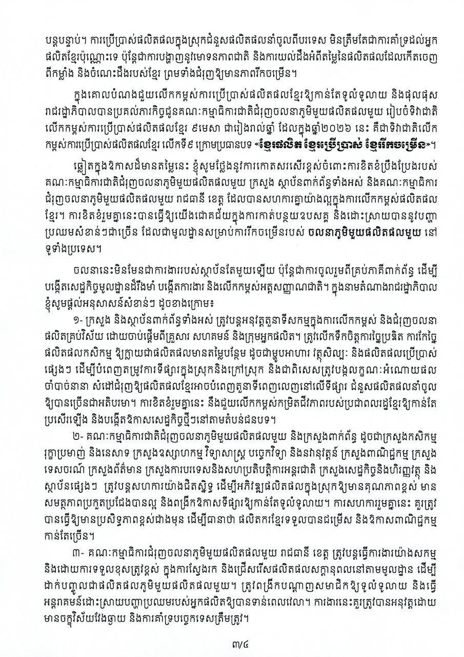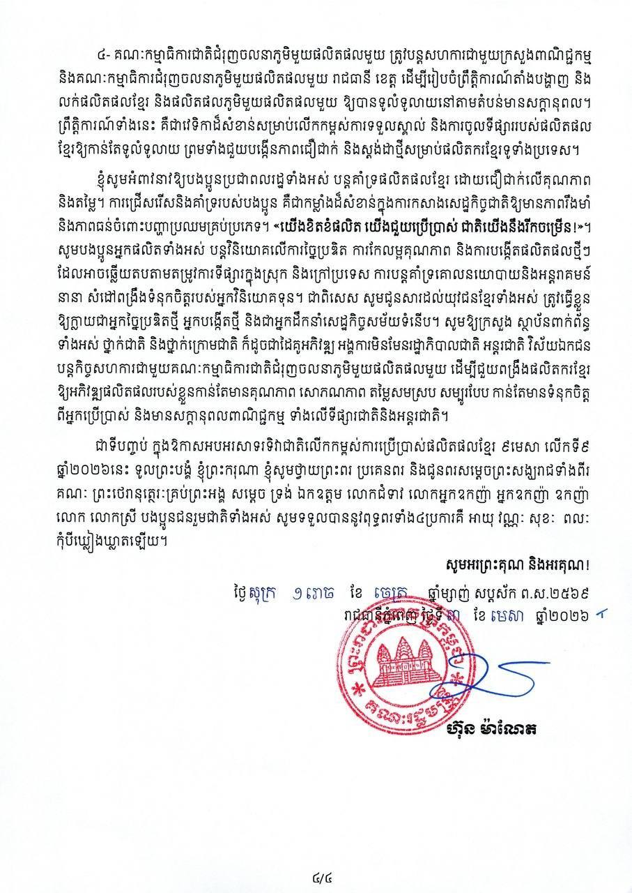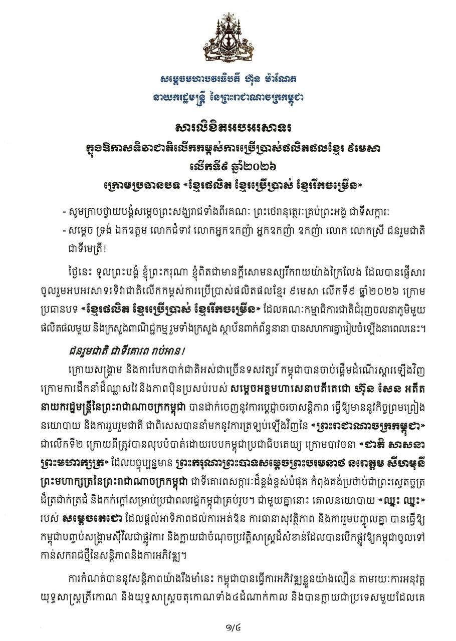 ក្នុងសារលិខិត ចុះថ្ងៃទី៣ ខែមេសា ឆ្នាំ២០២៦ ទិវាជាតិលើកម្ពស់ផលិតផលខ្មែរ នឹងត្រូវធ្វើឡើងក្រោមប្រធានបទ «ខ្មែរផលិត ខ្មែរប្រើប្រាស់ ខ្មែររីកចម្រើន» សម្តេចធិបតី បានបញ្ជាក់ថា ក្រោយសង្គ្រាម និងការបែកបាក់ជាតិអស់ជាច្រើនទសវត្សរ៍ កម្ពុជាបានចាប់ផ្តើមដំណើរស្តារឡើងវិញ ក្រោមការដឹកនាំដ៏ឈ្លាសវៃ និងភាពប៉ិនប្រសប់របស់ សម្តេចតេជោ ហ៊ុន សែន បានដាក់ចេញនូវការប្តេជ្ញាចរចាសន្តិភាព ធ្វើឱ្យមាននូវកិច្ចព្រមព្រៀង នយោបាយ និងការរួបរួមជាតិ ជាពិសេសបាននាំមកនូវការត្រឡប់ឡើងវិញនៃ «ព្រះរាជាណាចក្រកម្ពុជា» ជាលើកទី២ ក្រោយពីត្រូវបានលុបបំបាត់ដោយរបបកម្ពុជាប្រជាធិបតេយ្យ ក្រោមបាវចនា «ជាតិ សាសនា ព្រះមហាក្សត្រ» ដែលបច្ចុប្បន្នមាន ព្រះករុណាព្រះបាទសម្តេចព្រះបរមនាថ នរោត្តម សីហមុនី ព្រះមហាក្សត្រនៃព្រះរាជាណាចក្រកម្ពុជា ជាទីគោរពសក្ការៈដ៏ខ្ពង់ខ្ពស់បំផុត កំពុងគង់ប្រថាប់ជាព្រះស្វេតច្ឆត្រ ដ៏ត្រជាក់ត្រជំ និងកក់ក្តៅសម្រាប់ប្រជាពលរដ្ឋកម្ពុជាគ្រប់រូប។ ជាមួយគ្នានោះ គោលនយោបាយ «ឈ្នះ ឈ្នះ» របស់ សម្តេចតេជោ ដែលផ្តល់អាទិភាពដល់ការអត់ឱន ការធានាសុវត្ថិភាព និងការរួមបញ្ចូលគ្នា បានធ្វើឱ្យ កម្ពុជាបញ្ចប់សង្គ្រាមស៊ីវិលជាផ្លូវការ និងក្លាយជាចំណុចប្រវត្តិសាស្ត្រដ៏សំខាន់ដែលបានបើកផ្លូវឱ្យកម្ពុជាចូលទៅ កាន់សករាជថ្មីនៃសន្តិភាពនិងការអភិវឌ្ឍ។