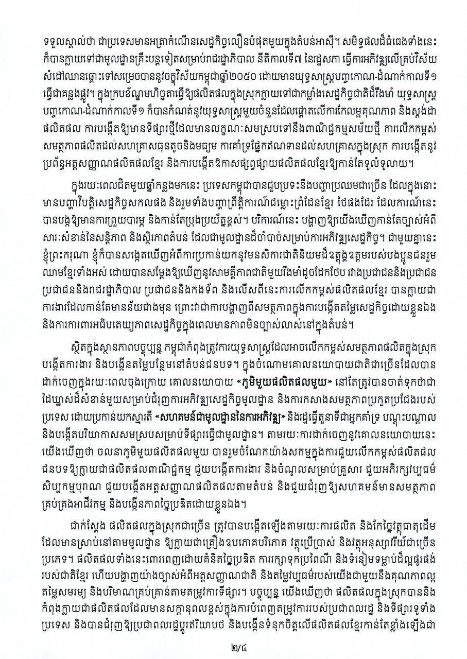 ក្នុងសារលិខិត បានឱ្យដឹងទៀតថា ការកំណត់បាននូវសន្តិភាពយ៉ាងរឹងមាំនេះ កម្ពុជាបានធ្វើការអភិវឌ្ឍខ្លួនយ៉ាងលឿន តាមរយៈការអនុវត្តយុទ្ធសាស្រ្តត្រីកោណ និងយុទ្ធសាស្រ្ត ចតុកោណទាំ៤ ដំណាក់កាល និងបានក្លាយជាប្រទេសមួយដែលគេទទួលស្គាល់ថា ជាប្រទេសមានអត្រាកំណើនសេដ្ឋកិច្ចលឿនបំផុតមួយក្នុងតំបន់អាស៊ី។ សមិទ្ធផលដ៏ធំធេងទាំងនេះ ក៏បានក្លាយទៅជាមូលដ្ឋានគ្រឹះបន្តទៀតសម្រាប់រាជរដ្ឋាភិបាល នីតិកាលទី៧ នៃរដ្ឋសភា ធ្វើការអភិវឌ្ឍលើគ្រប់វិស័យ សំដៅឈានឆ្ពោះទៅសម្រេចបាននូវចក្ខុវិស័យកម្ពុជាឆ្នាំ២០៥០ ដោយមានយុទ្ធសាស្ត្របញ្ចកោណ-ដំណាក់កាលទី១ ធ្វើជាគន្លងផ្លូវ។