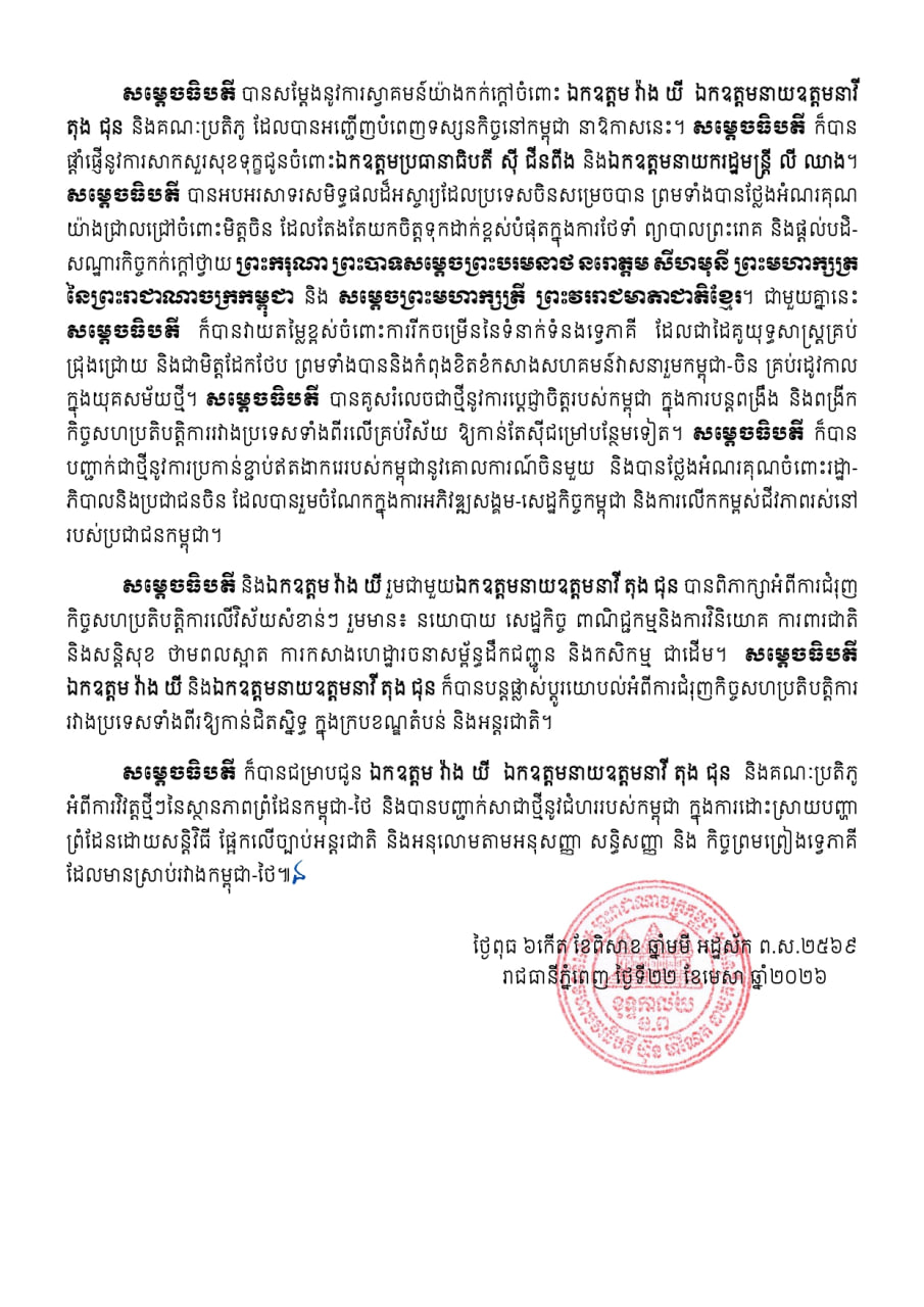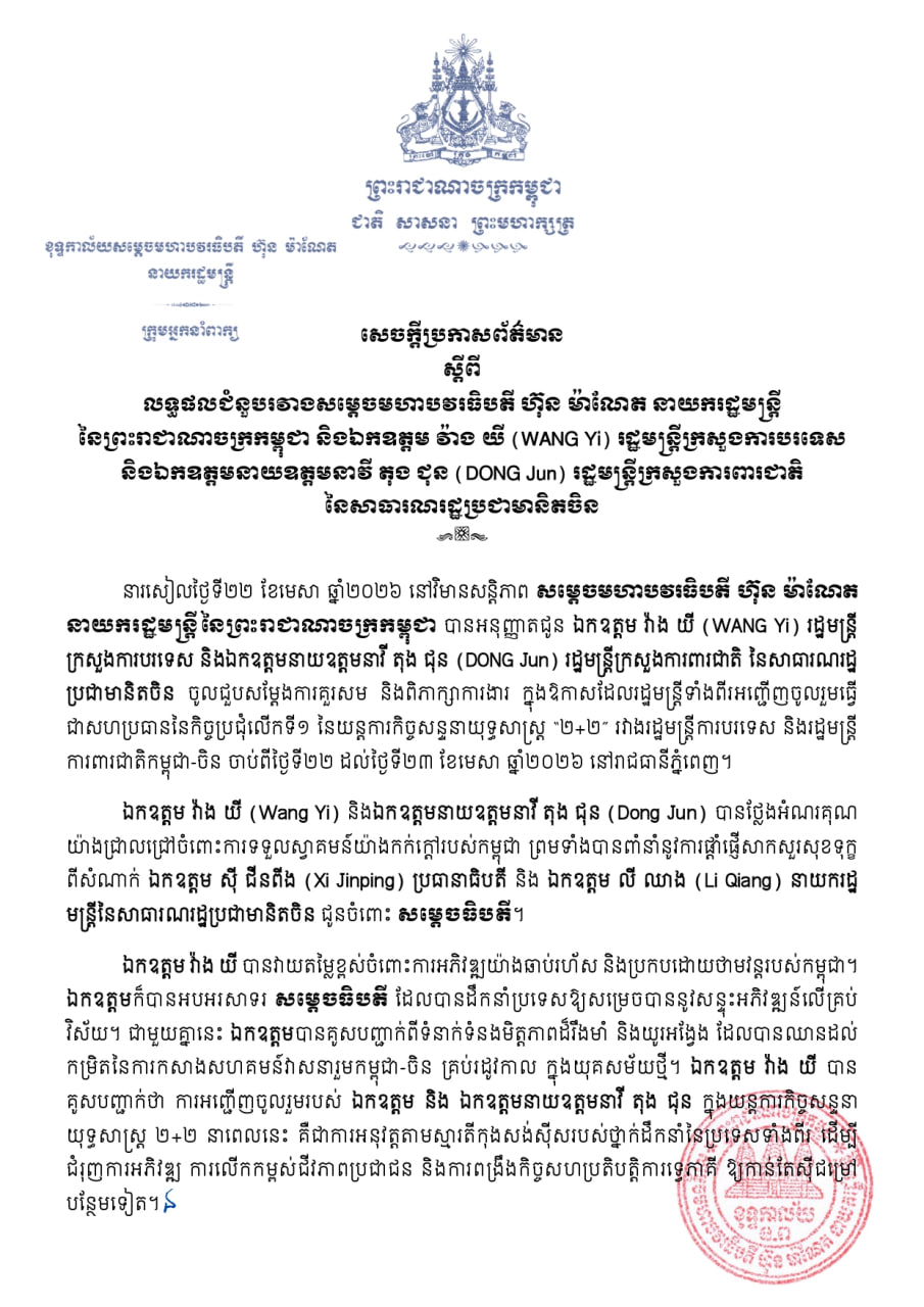 យោងតាមសេចក្តីប្រកាសព័ត៌មានស្តីពី លទ្ធផលជំនួបជាមួយ ឯកឧត្តម វ៉ាង យី (WANG Yi) រដ្ឋមន្ត្រីក្រសួងការបរទេស និងឯកឧត្តមនាយឧត្តមនាវី តុង ជុន (DONG Jun) រដ្ឋមន្ត្រីក្រសួងការពារជាតិ នៃសាធារណរដ្ឋប្រជាមានិតចិន នៅវិមានសន្តិភាព រសៀលថ្ងៃទី២២ ខែមេសា ឆ្នាំ២០២៦ សម្តេចធិបតី ហ៊ុន ម៉ាណែត នាយករដ្ឋមន្ត្រី នៃព្រះរាជាណាចក្រកម្ពុជា បានជម្រាបជូនអំពីការវិវត្តថ្មីៗនៃស្ថានភាពព្រំដែនកម្ពុជា-ថៃ និងបានបញ្ជាក់សាជាថ្មីនូវជំហររបស់កម្ពុជា ក្នុងការដោះស្រាយបញ្ហាព្រំដែនដោយសន្តិវិធី ផ្អែកលើច្បាប់អន្តរជាតិ និងអនុលោមតាមអនុសញ្ញា សន្ធិសញ្ញា និងកិច្ចព្រមព្រៀងទ្វេភាគីដែលមានស្រាប់រវាងកម្ពុជា-ថៃ។