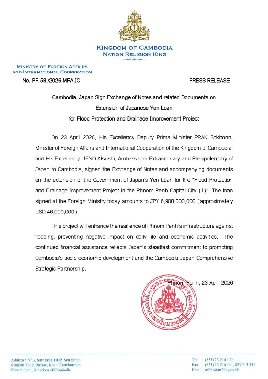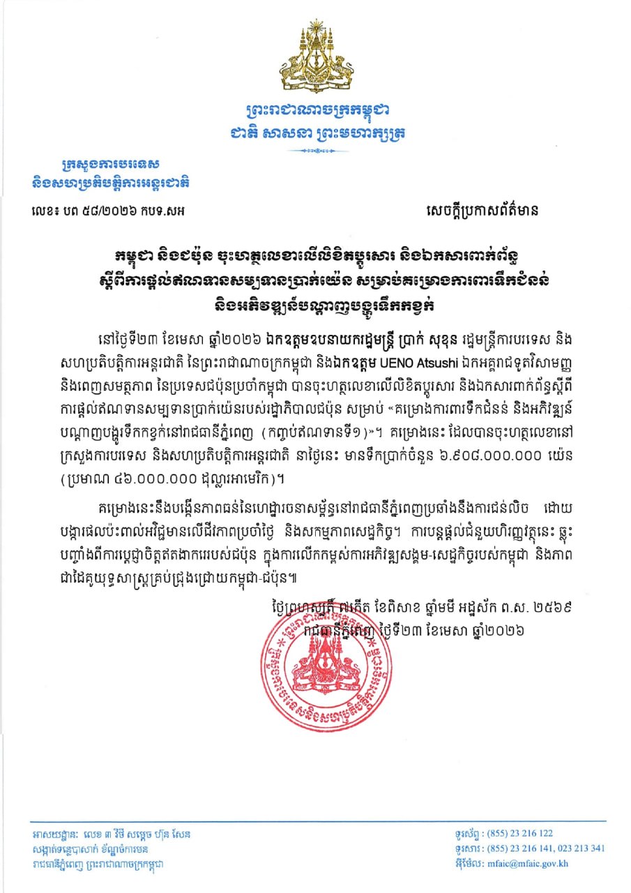 ពិធីចុះហត្ថលេខាលើលិខិតប្តូរសារ និងឯកសារពាក់ព័ន្ធស្តីពី ការផ្តល់ឥណទានសម្បទានប្រាក់យ៉េនរបស់រដ្ឋាភិបាលជប៉ុនដែលមានទឹកប្រាក់ប្រមាណ៤៦លានដុល្លារអាមេរិក បានធ្វើឡើងនៅថ្ងៃទី២៣ ខែមេសា ឆ្នាំ២០២៦ រវាងឯកឧត្តមឧបនាយករដ្ឋមន្ត្រី ប្រាក់ សុខុន រដ្ឋមន្ត្រីការបរទេស និងសហប្រតិបត្តិការអន្តរជាតិ និងឯកឧត្តម UENO Atsushi ឯកអគ្គរាជទូតវិសាមញ្ញ និងពេញសមត្ថភាព នៃប្រទេសជប៉ុនប្រចាំកម្ពុជា។