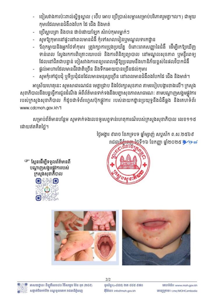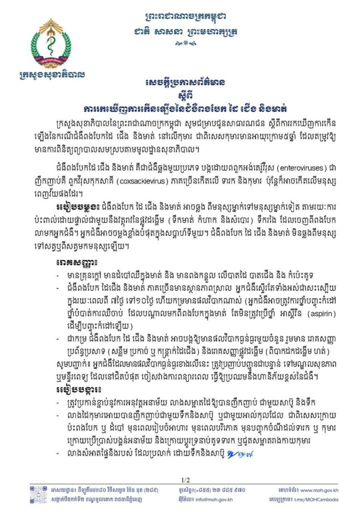 សេចក្តីប្រកាសព័ត៌មាន ស្តីពីការរកឃើញការកើនឡើងនៃជំងឺពងបែក ដៃ ជើង និងមាត់