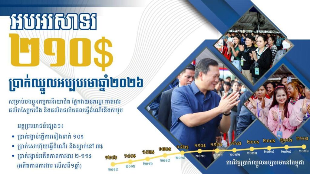 Cambodian Prime Minister Hun Manet said on Wednesday that the kingdom set a new monthly minimum wage for the garment, footwear and travel goods industry at 210 U.S. dollars for 2026.