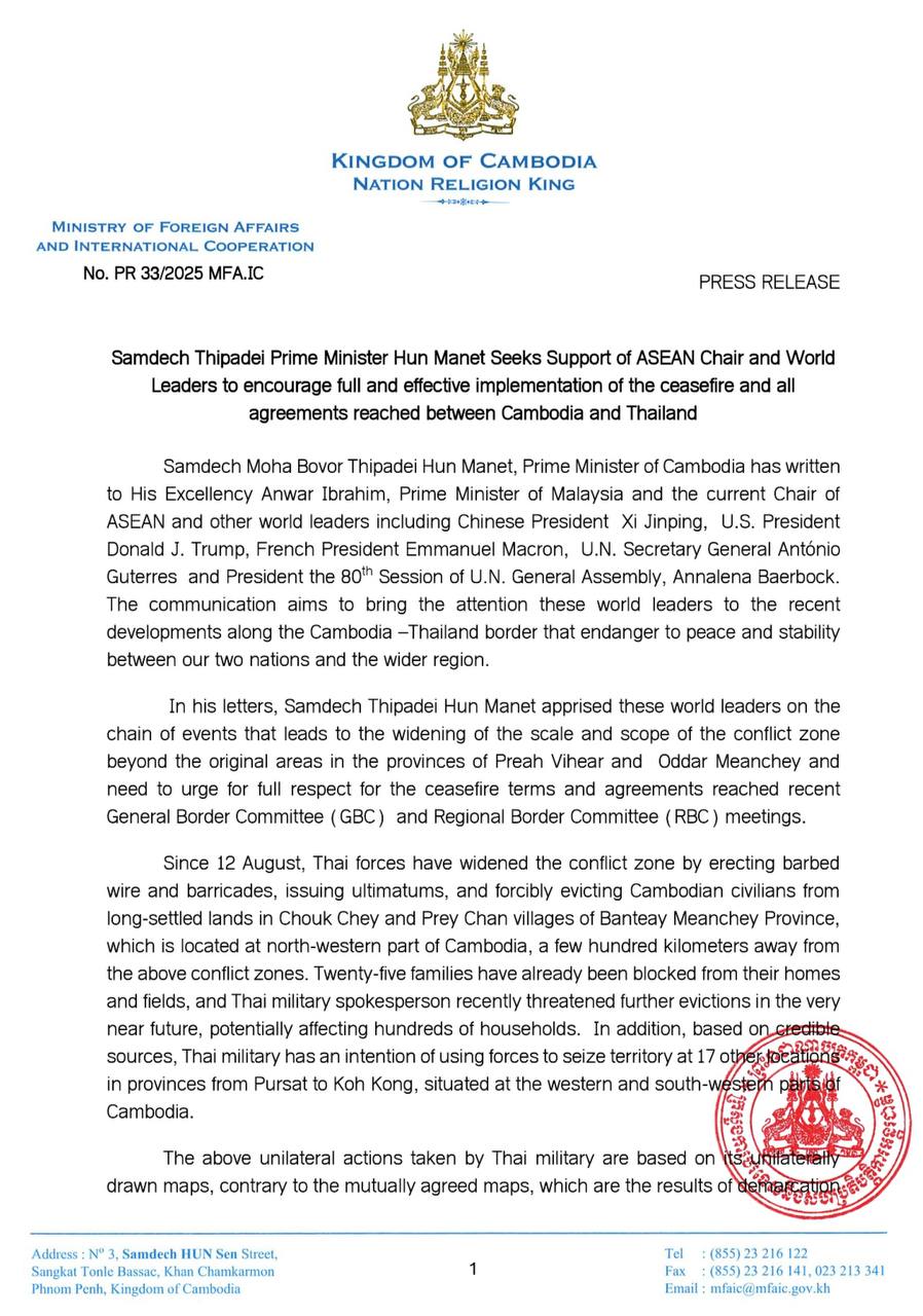 Phnom Penh, Sept. 17, 2025 – Samdech Moha Bovor Thipadei Hun Manet has written urgent letters to Malaysian Prime Minister Anwar Ibrahim, in his capacity as ASEAN Chair, and to key world leaders, including Chinese President Xi Jinping, U.S. President Donald J. Trump, French President Emmanuel Macron, U.N. Secretary-General António Guterres, and President of the 80th Session of the U.N. General Assembly Annalena Baerbock, seeking their support in ensuring the full and effective implementation of the ceasefire and agreements reached between Cambodia and Thailand.