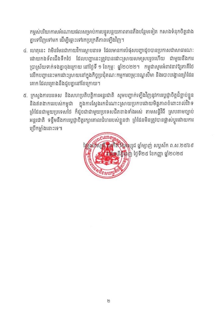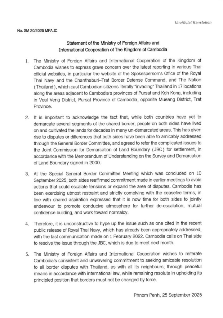 យោងតាមសេចក្តីថ្លែងការណ៍របស់ក្រសួងការបរទេស និងសហប្រតិបត្តិការអន្តរជាតិ នៃព្រះរាជាណាចក្រកម្ពុជា នៅថ្ងៃទី២៥ ខែកញ្ញា ឆ្នាំ២០២៥ នេះ បានបញ្ជាក់ថា កម្ពុជាបានសម្ដែងនូវការព្រួយបារម្ភជាខ្លាំងចំពោះសេចក្តីរាយការណ៍ថ្មីៗនេះ នៅលើគេហទំព័រផ្លូវការនានារបស់ប្រទេសថៃ ជាពិសេសគេហទំព័ររបស់ការិយាល័យអ្នកនាំពាក្យកងទ័ពជើងទឹក និងទីបញ្ជាការដ្ឋានការពារព្រំដែនច័ន្ទបុរី-ត្រាត ព្រមទាំងកាសែត The Nation (ប្រទេសថៃ) ដែលហាក់ដូចជាបង្ហាញថាប្រជាពលរដ្ឋខ្មែរកំពុងតែ «ឈ្លានពាន» ទឹកដីថៃ នៅទីតាំងចំនួន១៧ រាប់ចាប់ពីខេត្តពោធិ៍សាត់ រហូតដល់ខេត្តកោះកុង រួមទាំងតំបន់មួយចំនួនក្នុងស្រុកវាលវែង ខេត្តពោធិ៍សាត់ នៃប្រទេសកម្ពុជា ដែលស្ថិតនៅទល់មុខនឹងស្រុកមឿង ខេត្តត្រាត នៃប្រទេសថៃ។