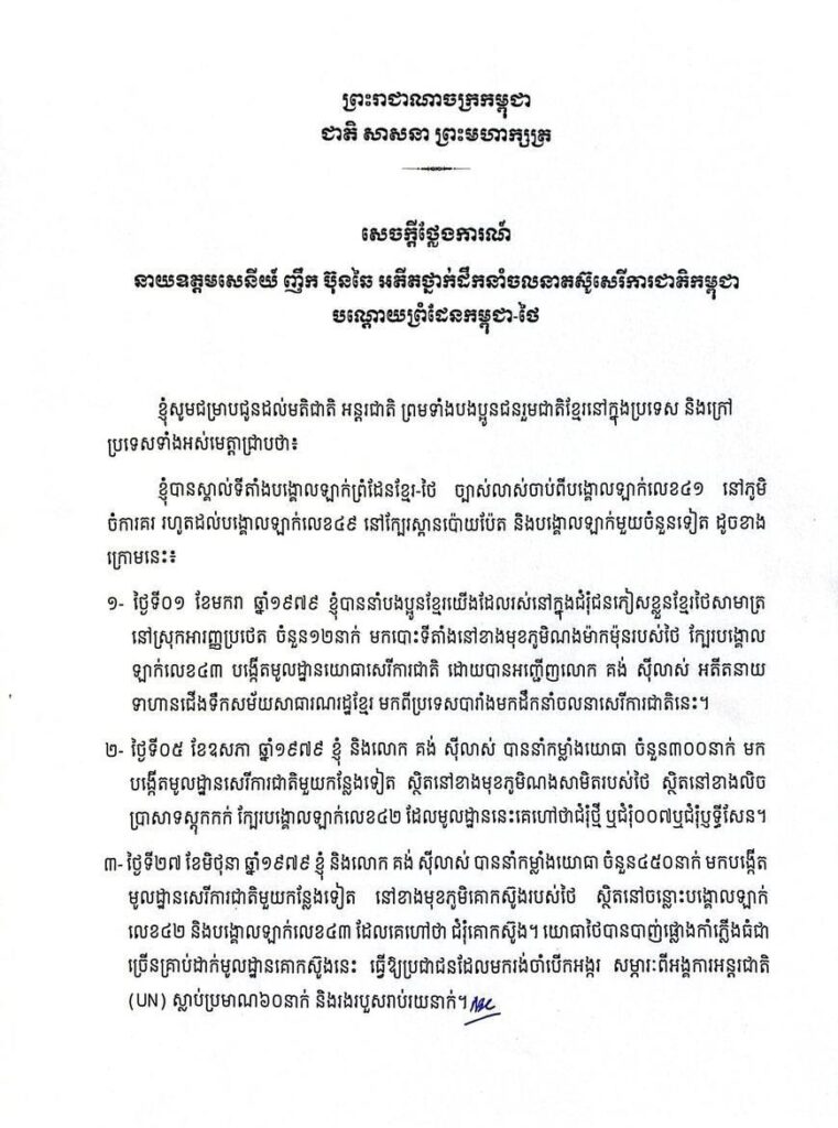 ខ្ញុំសូមជម្រាបជូនដល់មតិជាតិ អន្តរជាតិ ព្រមទាំងបងប្អូនជនរួមជាតិខ្មែរនៅក្នុងប្រទេស និងក្រៅ ប្រទេសទាំងអស់មេត្តាជ្រាបថា៖