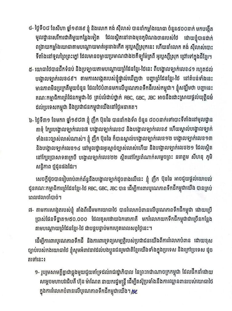 ដើម្បីការពារបូរណភាពទឹកដី និងការពារទ្រព្យសម្បត្តិរបស់ប្រជាជនយើងពីការរំលោភបំពានដោយខុស ច្បាប់របស់កងយោធាថៃ ខ្ញុំសូមអំពាវនាវដល់បងប្អូនជនរួមជាតិខ្មែរយើងទាំងក្នុងប្រទេសនិងក្រៅប្រទេស ដូច