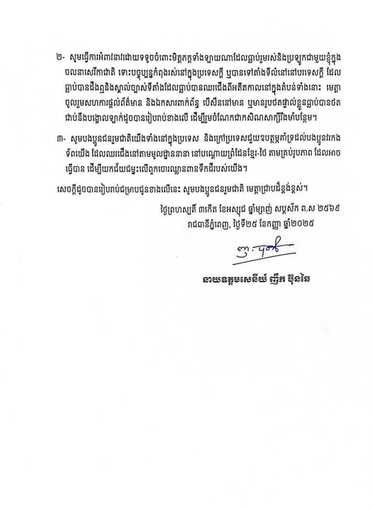 ៣- សូមបងប្អូនជនរួមជាតិយើងទាំងនៅក្នុងប្រទេស និងក្រៅប្រទេសជួយឧបត្ថម្ភគាំទ្រដល់បងប្អូនវរកង ទ័ពយើង ដែលឈរជើងនៅតាមមូលដ្ឋាននានា នៅបណ្ដោយព្រំដែនខ្មែរ-ថៃ តាមគ្រប់រូបភាព ដែលអាច ធ្វើបាន ដើម្បីយកជ័យជម្នះលើពួកចោរឈ្លានពានទឹកដីរបស់យើង។