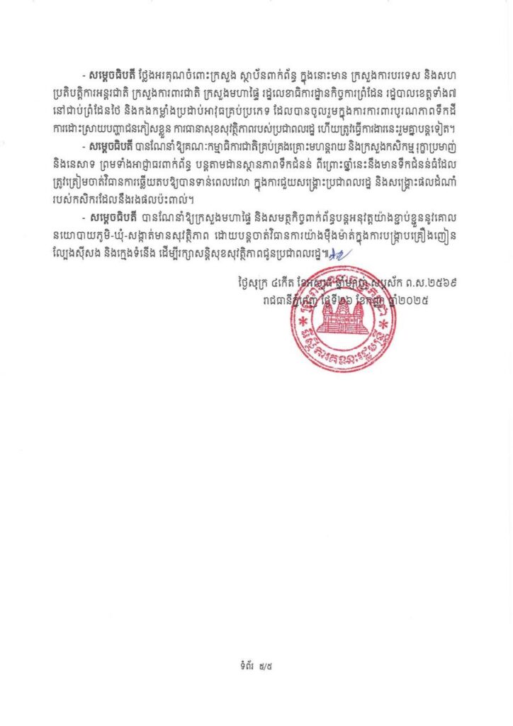 នៅក្នុងសេចក្តីប្រកាសព័ត៌មាននោះដែរបានឱ្យដឹងថា សម្តេចធិបតី ហ៊ុន ម៉ាណែត ក៏បានគូសបញ្ជាក់សាជាថ្មី អំពីគោលជំហរដ៏ម៉ឺងម៉ាត់របស់រាជរដ្ឋាភិបាលក្នុងការគោរពច្បាប់អន្តរជាតិ ដើម្បីដោះស្រាយបញ្ហាព្រំដែនដោយ សន្តិវិធី។