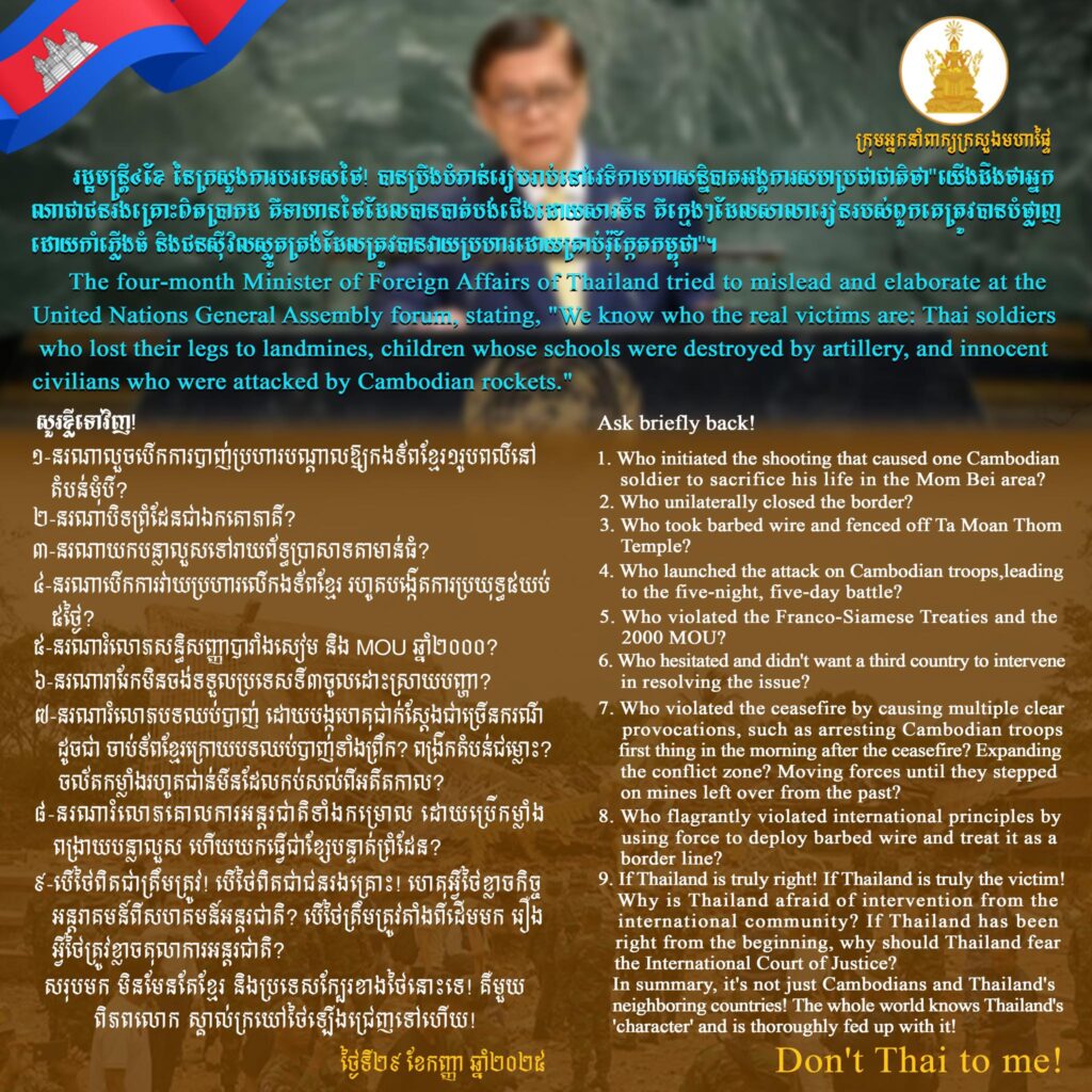 ក្រសួងមហាផ្ទៃកម្ពុជា ចោទសួរ៩ចំណុច ទៅរដ្ឋមន្ត្រីការបរទេសថៃ ដែលបានប្រឹងបំភាន់រៀបរាប់នៅវេទិកាមហាសន្និបាតអង្គការសហប្រជាជាតិ