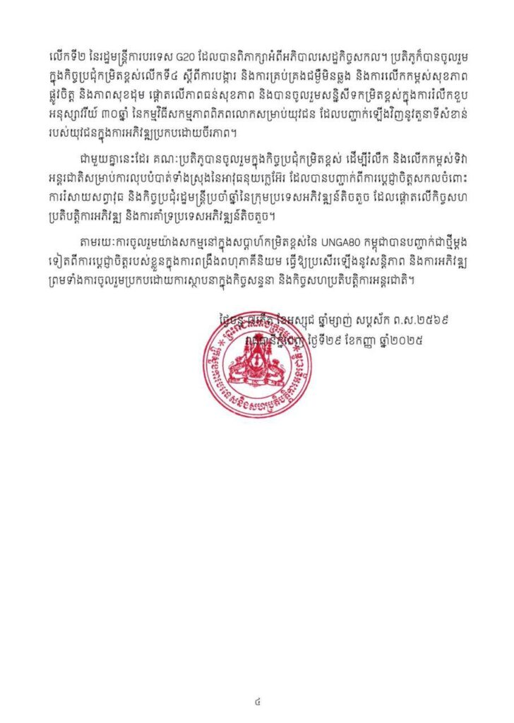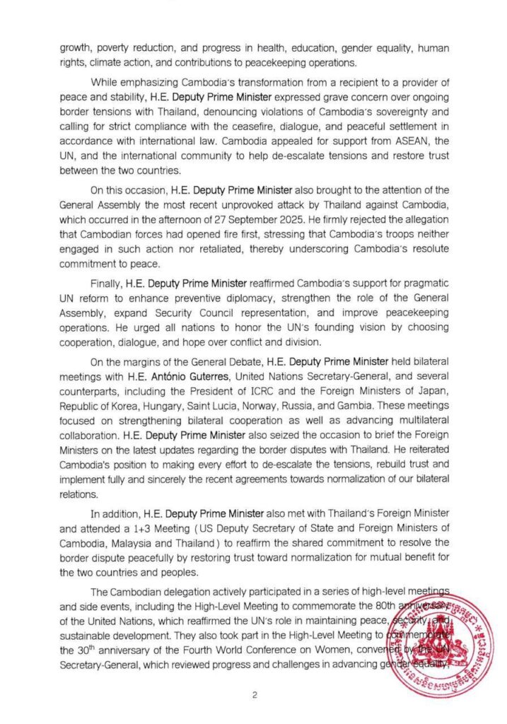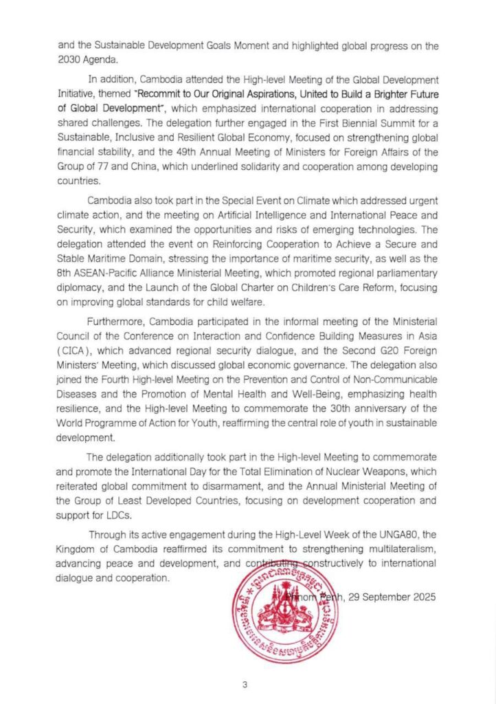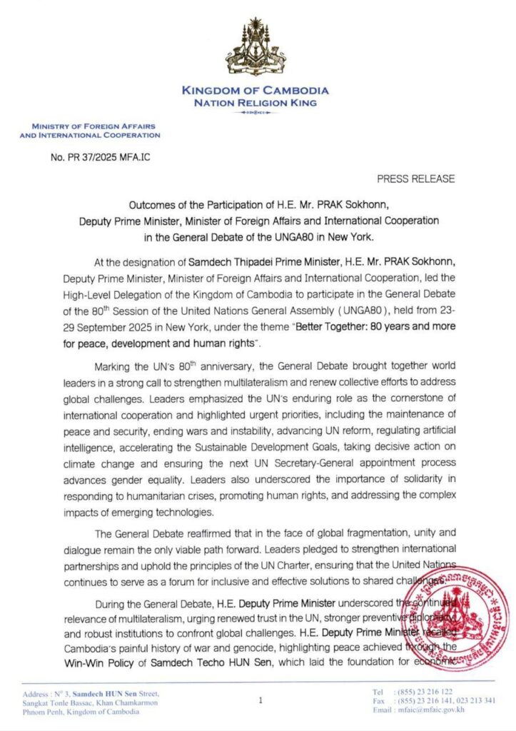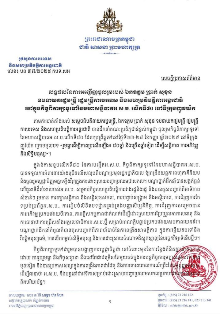 យោងតាមសេចក្តីប្រកាសព័ត៌មានរបស់ក្រសួងការបរទេសនិងសហប្រតិបត្តិការអន្តរជាតិចុះថ្ងៃទី២៩ ខែកញ្ញា ឆ្នាំ២០២៥ ស្តីពីលទ្ធផលនៃការអញ្ជើញចូលរួមរបស់ ឯកឧត្ដម ប្រាក់ សុខុន នៅក្នុងកិច្ចពិភាក្សាទូទៅនៃមហាសន្និបាតអ.ស.ប. លើកទី៨០ នៅទីក្រុងញូវយ៉ក
