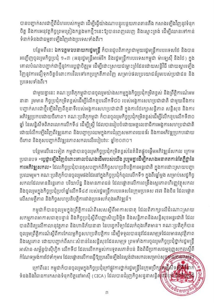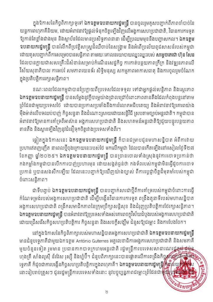 បានឱ្យដឹងថា ឯកឧត្តមឧបនាយករដ្ឋមន្ត្រី ប្រាក់ សុខុន បានសម្តែងនូវក្តីបារម្ភយ៉ាងជ្រាលជ្រៅចំពោះភាពតានតឹងដែលកំពុងបន្តនៅតាមព្រំដែនជាមួយប្រទេសថៃ ដោយបានប្រកាសប្រឆាំងនឹងការរំលោភអធិបតេយ្យ និងអំពាវនាវឱ្យគោរពយ៉ាងម៉ឺងម៉ាត់លើបទឈប់បាញ់ កិច្ចសន្ទនា និងដំណោះស្រាយដោយសន្តិវិធីស្របតាមច្បាប់អន្តរជាតិ។ កម្ពុជាបានអំពាវនាវឱ្យមានការគាំទ្រពីអាស៊ាន អង្គការសហប្រជាជាតិ និងសហគមន៍អន្តរជាតិឱ្យជួយបន្ធូរបន្ថយភាពតានតឹង និងស្តារឡើងវិញនូវជំនឿទុកចិត្តរវាងប្រទេសទាំងពីរ។