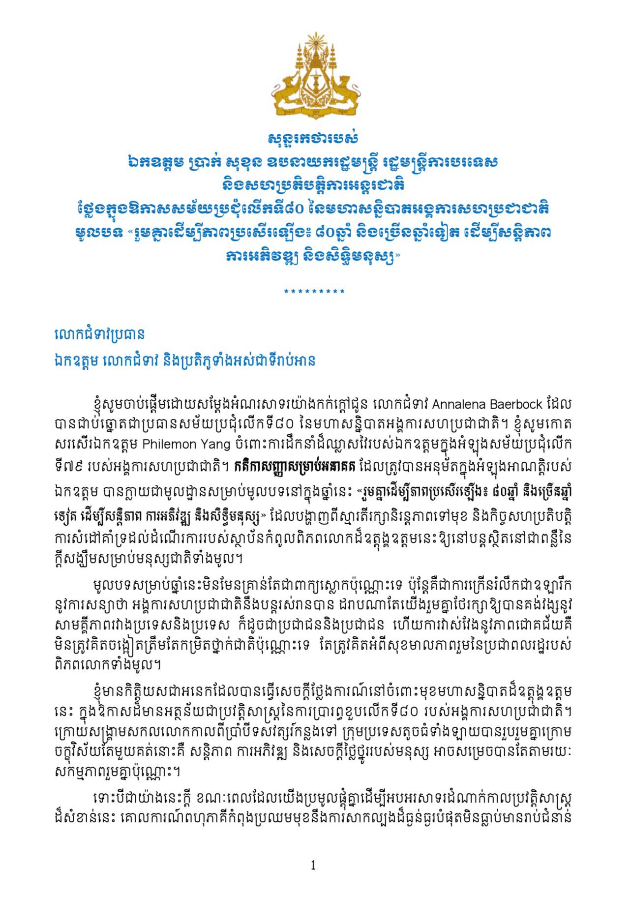 សុន្ទរកថារបស់ ឯកឧត្តម ប្រាក់ សុខុន ឧបនាយករដ្ឋមន្ត្រី រដ្ឋមន្ត្រីការបរទេស និងសហប្រតិបត្តិការអន្តរជាតិ ថ្លែងក្នុងឱកាសសម័យប្រជុំលើកទី៨០ នៃមហាសន្និបាតអង្គការសហប្រជាជាតិ